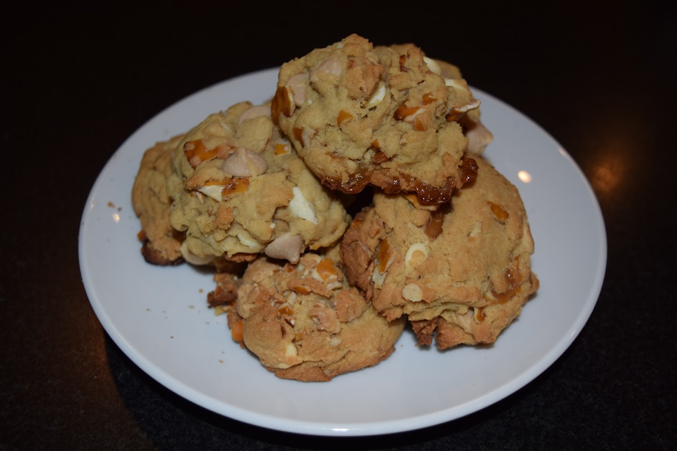 - Add in the pretzel crisps, white chocolate chips and caramel chips. Mix until combined.